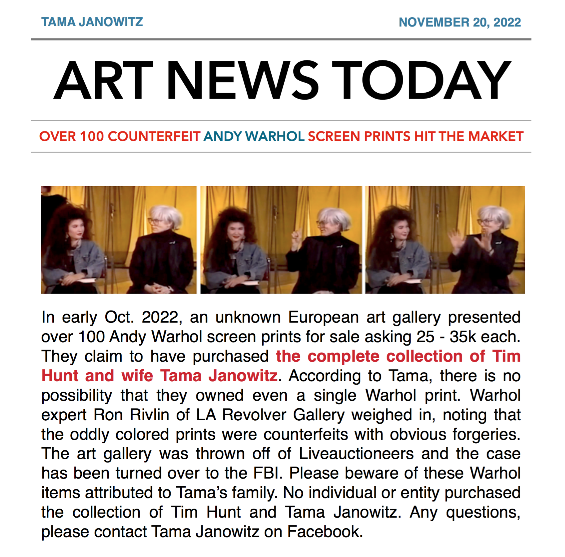 to Tama’s family. No individual or entity purchased the collection of Tim Hunt and Tama Janowitz. Any questions, please contact TAMA JANOWITZ on Facebook.